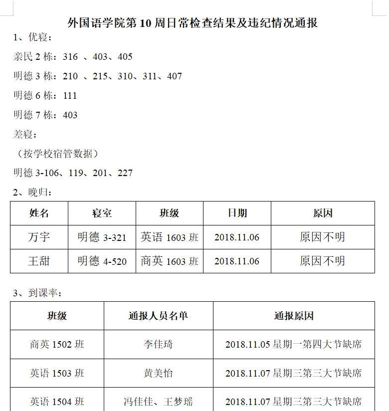 beats365官方网站第10周日常检查结果及违纪情况通报