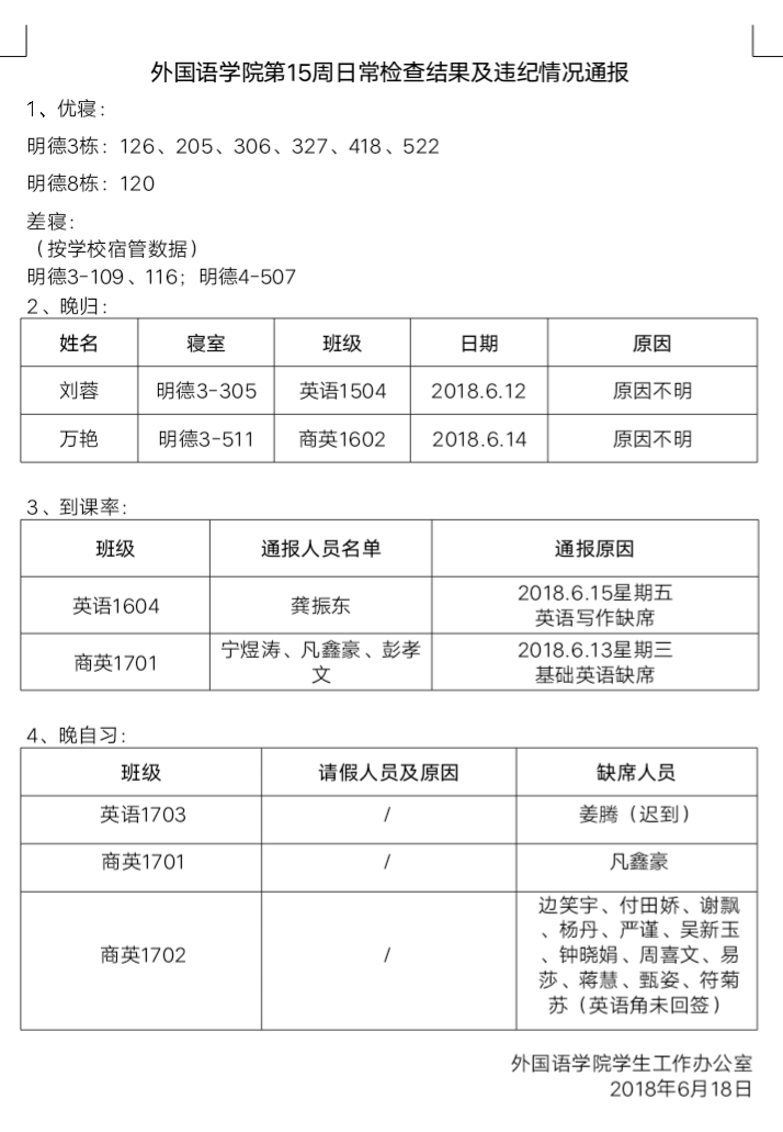 beats365官方网站第15周日常检查结果及违纪情况通报