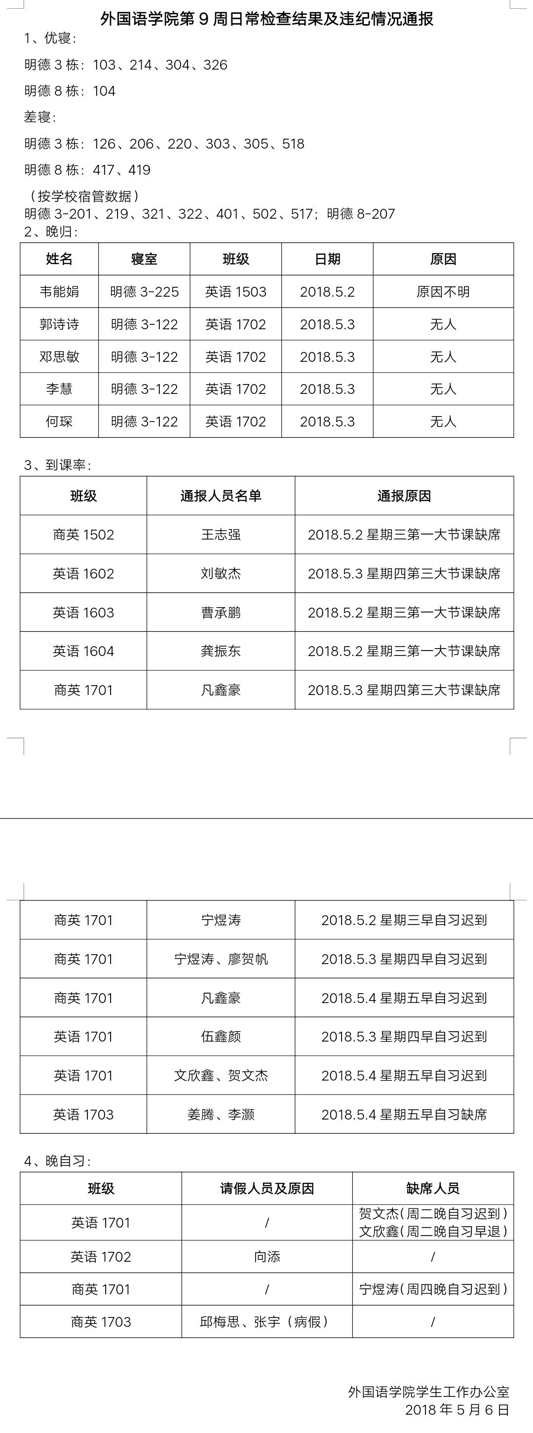 beats365官方网站第9周日常检查结果及违纪情况通报