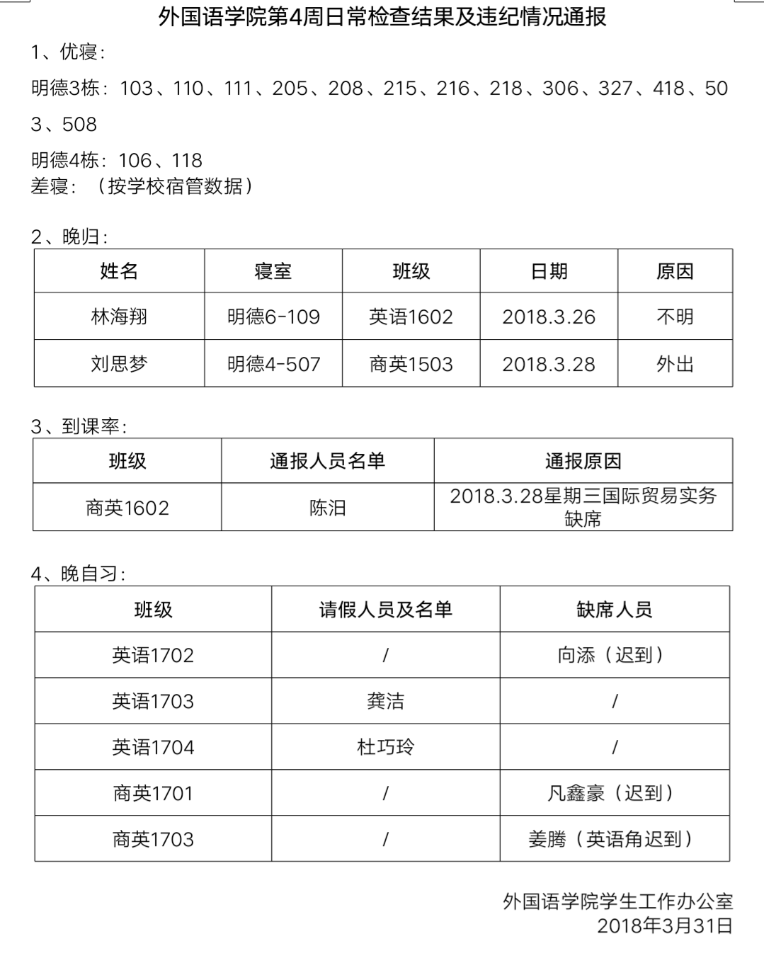 beats365官方网站第4周日常检查结果及违纪情况通报