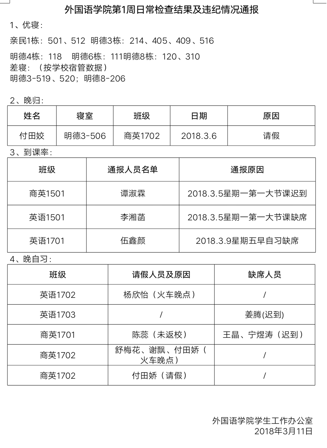 beats365官方网站第1周日常检查结果及违纪情况通报