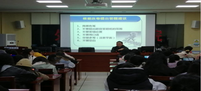 讲座伊始,王教授为考研学子分析了现今考研的基本情况,并就其多年改卷的丰富经历提出了答题建议。当前考研已经进入了紧张的冲刺阶段,时间的紧迫带给同学们些许焦虑,但在讲座中,王教授倾囊相授,为同学们加油打气,给出了许多实用的复习建议,希望他们能留有足够的时间复习自己的薄弱项,并为23届考生们讲重点押题,缩小复习范围,用最好的状态去迎接最后的冲刺。知己知彼方能百战百胜,要想能在考场胜出,自然要了解考试题型。在讲座中,王教授为同学们分析了考试题型及分值分布,教授了答题方法和技巧,让他们能更好地把握时间,不慌不忙,分时间段做答。王献志教授深谙考研之道,他对题型把握的精准,增加了同学们的考研信心,提高了学习兴趣,明确了奋斗目标。