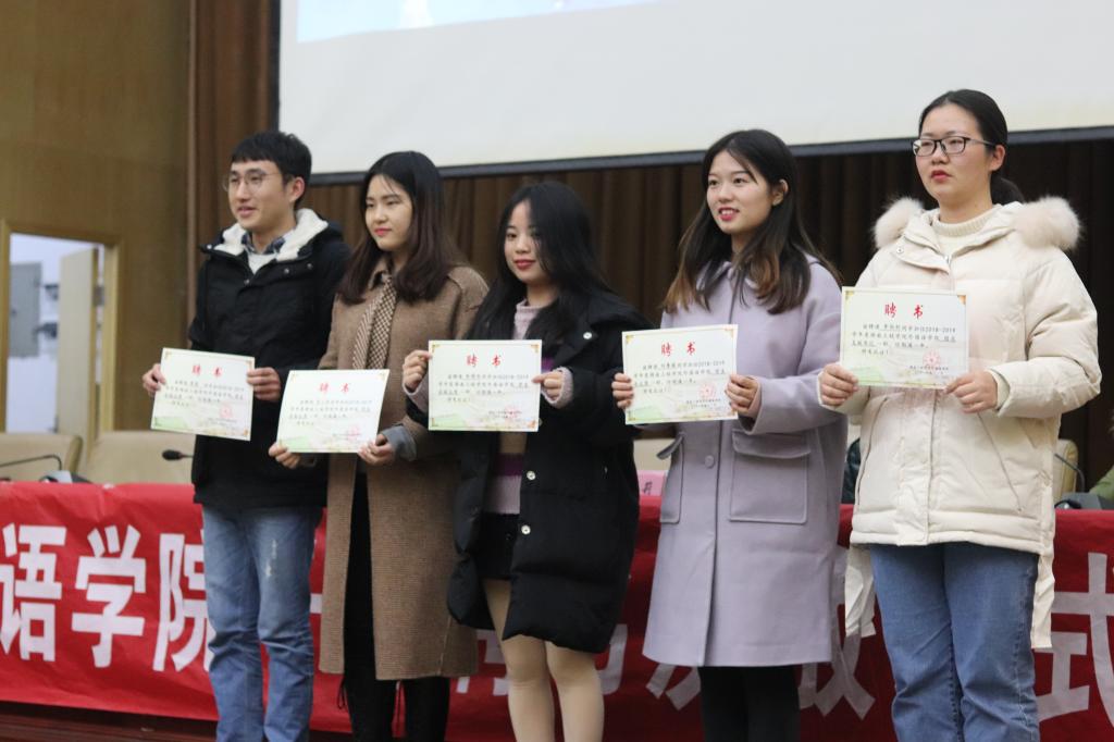 在干部聘书发放仪式上,肖书记对团学会干部顾大局、抓细节、肯吃苦、勤自省的工作态度表示肯定。她希望团学会的每一个成员都明确自己肩负的责任,不断增强外院团学会的凝聚力和感召力,充分发挥桥梁和纽带的作用,把广大同学紧密联系在一起。随后上届团学会主席刘菁薇发表讲话。她表示,三年的团学会生活让她收获了真心的友谊、沉稳的心态、不忘初心的使命感和切实的行动意识。她指出,要把团学会建设成领导放心、同学满意的队伍,需要团学会全体成员秉持奉献之心,多些热情稳重,少点消极懈怠,热情细心地服务同学,沉稳踏实地对待工作。接下来,2018届优秀干部代表姚晓玥上台发言。她从实际出发,强调团学会干部要摆正位置,严谨负责地对待工作,明确“为同学服务”的宗旨,在突破困难中获得成长、实现价值。在之后的校运会表彰大会上,阮才涛代表运动员上台发言,感谢了公司领导、老师的关心支持与员工会工作人员的幕后支持,他分享了参加校运会的心路历程,表示要把在校运会上体现出的勇往直前,积极进取的精神带到今后的学习生活中。最后,老师们为获奖运动员和运动会积极分子颁奖并合影留念。