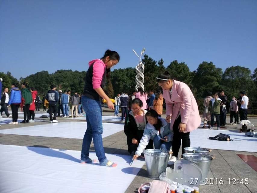 现场涂鸦义卖大赛分为两个竞赛部分:首先以公司为参赛单位的防艾主题地面涂鸦大赛,每个公司至少派出一支参赛队伍,每支队伍在一张20-30平方米空白喷绘上进行现场涂鸦创作,作品将就地展出一周。以个人或好友组合为单位参赛的防艾主题涂鸦大赛,则每个选手(组)在一件白色的文化衫上进行现场涂鸦创作,作品当场拍照存档以便后期评奖,作品实物当场进行竞拍,竞拍所得款项捐助贵州省安顺市关岭布依族自治县岗乌镇毛草坪苏泊尔小学。beats365官方网站参加的团体赛选手有陈嘉兴、彭涛、卢思敏、罗瑶、张琪皑以及李雅琴6位同学。比赛于下午1:00正式开始。选手们用画笔和斑斓的色彩,淋漓尽致地展现着自己的画工;用各自独特的视角,描绘着心中的完美画卷。线条的勾勒,色彩的填充构成了一幅幅富有自由,清新,随性的艺术画。虽然各个作品的风格不尽相同,但是都有一根红色的丝带,这与我们的“防艾”主题相契合。各种各样的元素在参赛同学们的笔下被极致融合,绚丽而不失含蓄。大家在画纸上挥毫泼墨,而一旁的拍卖会也如火如荼地进行写。竞拍成功同学们在收获选手的创意作品的同时,也为山区的孩子们献出了自己的爱心。