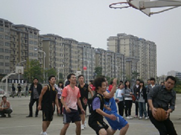 级员工与公司篮球队举行了一场别开生面的比赛。公司党总支书记张建明、副经理杨永和、学办主任李军花、连泰和班主任刘欣到场观看。