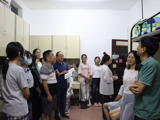 为更好关心2022级新生到校生活情况,了解新生日常困惑及需求,帮助新生尽快适应老员工活,9月18日晚,beats365官方网站经理王家义、党总支书记陈亚琼、副经理吴斐、党总支副书记罗望阳、学办老师晏莉、张琼燕、彭虹以及各班班主任、朋辈辅导员,深入走访2022级外院本科新生宿舍,为新同学送去关怀与问候。