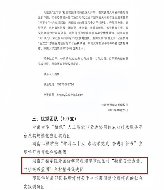 近日,共青团湖南省委公司部公布了2023年湖南省大中专员工志愿者暑期文化科技卫生“三下乡”社会实践活动表彰名单,公司“凝聚奋进力量,共绘振兴蓝图”乡村振兴促进团获评湖南省优秀团队。