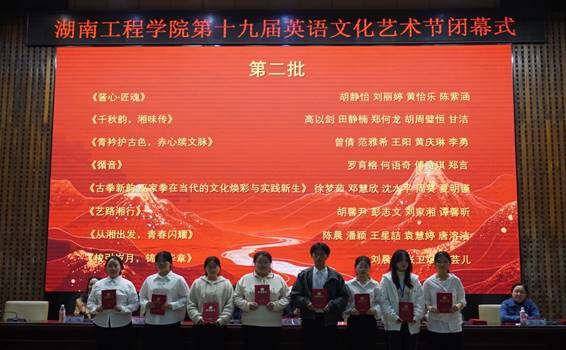 闭幕式在激情洋溢的英文歌曲《Go Again》中拉开帷幕。英文歌唱比赛获奖选手代表用嘹亮的歌声点燃全场,传递梦想与力量。随后,“用英语讲好湖南故事”短视频大赛全国特等奖作品《燃不尽的烈焰 舞不尽的热爱》带领师生走进湘潭火龙舞,展现传统技艺在现代化、年轻化进程中的传承与创新,诠释了深厚的文化韧性与精神力量。英语配音大赛获奖团队现场演绎《青春变形记》片段,将语言艺术与青春魅力完美结合,赢得全场喝彩。