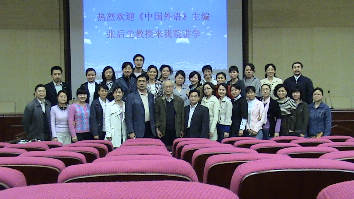 下午,张后尘教授给全院师生做了一场充满了精彩的学术讲座。学术讲座的题目为《学术研究中的几个问题》,主要内容如下:一、 准备是学术研究的基础:学术准备包括哲学准备、数学准备、多学科知识的准备、定向准备、跨学科研究的思想准备;二、 创新是科研发展的动力;三、 开疆是科研工作的目标。张后尘教授还结合实际情况,介绍了《中国外语》杂志的学术思想和用稿原则,鼓励青年教师勇于探索、勤奋创新,希望看到beats365官方网站更多的学术成果。讲座旁征博引、例证丰富、生动有趣,对beats365官方网站师生来说是一次难得的学术洗礼。学术讲座结束后,张后尘教授与beats365官方网站的教师集体合影。