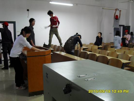 活动一开始,所有志愿者便被分成了几个小组,戴上小红帽,拿着小刀或抹布,分别清除教学楼黑板、墙壁和玻璃上的“牛皮癣”。每位同学都怀着满腔的热情,认真地与顽固的“牛皮癣”作战,经过一个小时的努力,教室、墙壁和玻璃终于恢复了干净的面孔,志愿者们也露出了心满意足的微笑。