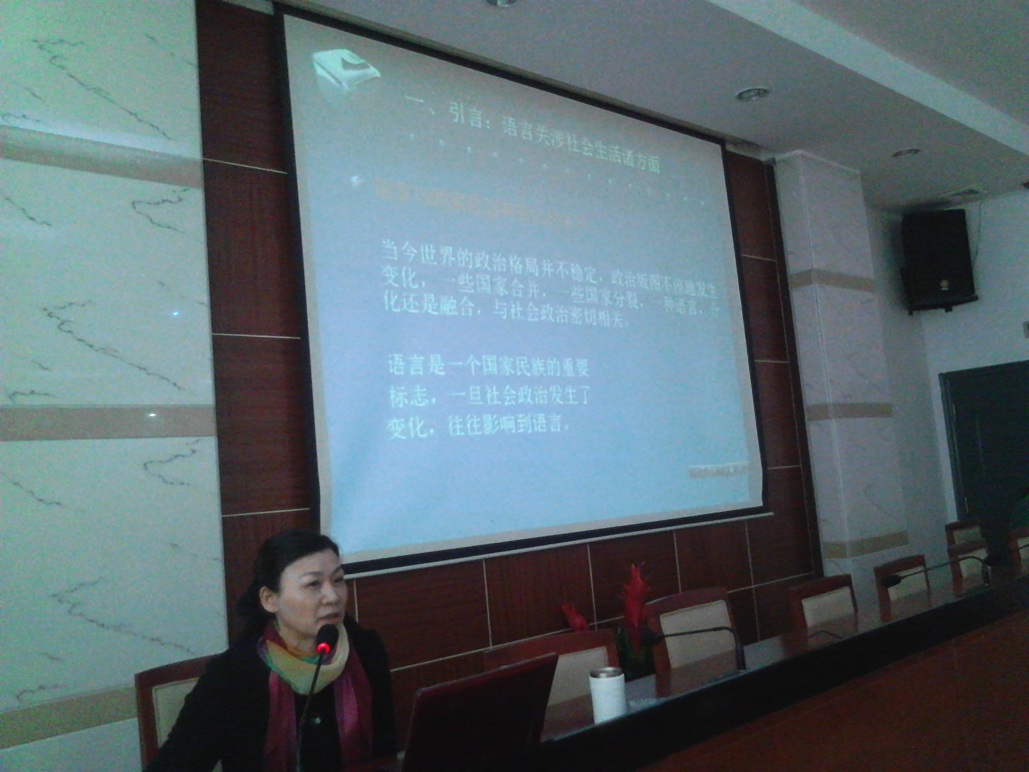 文卫平教授的学术报告分为四部分:第一,语言关涉社会生活的诸方面;第二,社会现象在语言中的折射;第三,语言对社会生活的影响;第四,语言与社会的互构。文教授从语言关乎名族的认同,语言调解人际关系和语言影响社会态度等方面以详实生动的例证详细阐明了语言对我们社会生活的影响。她指出语言和社会是共变的,语言和社会相互影响,相互作用。