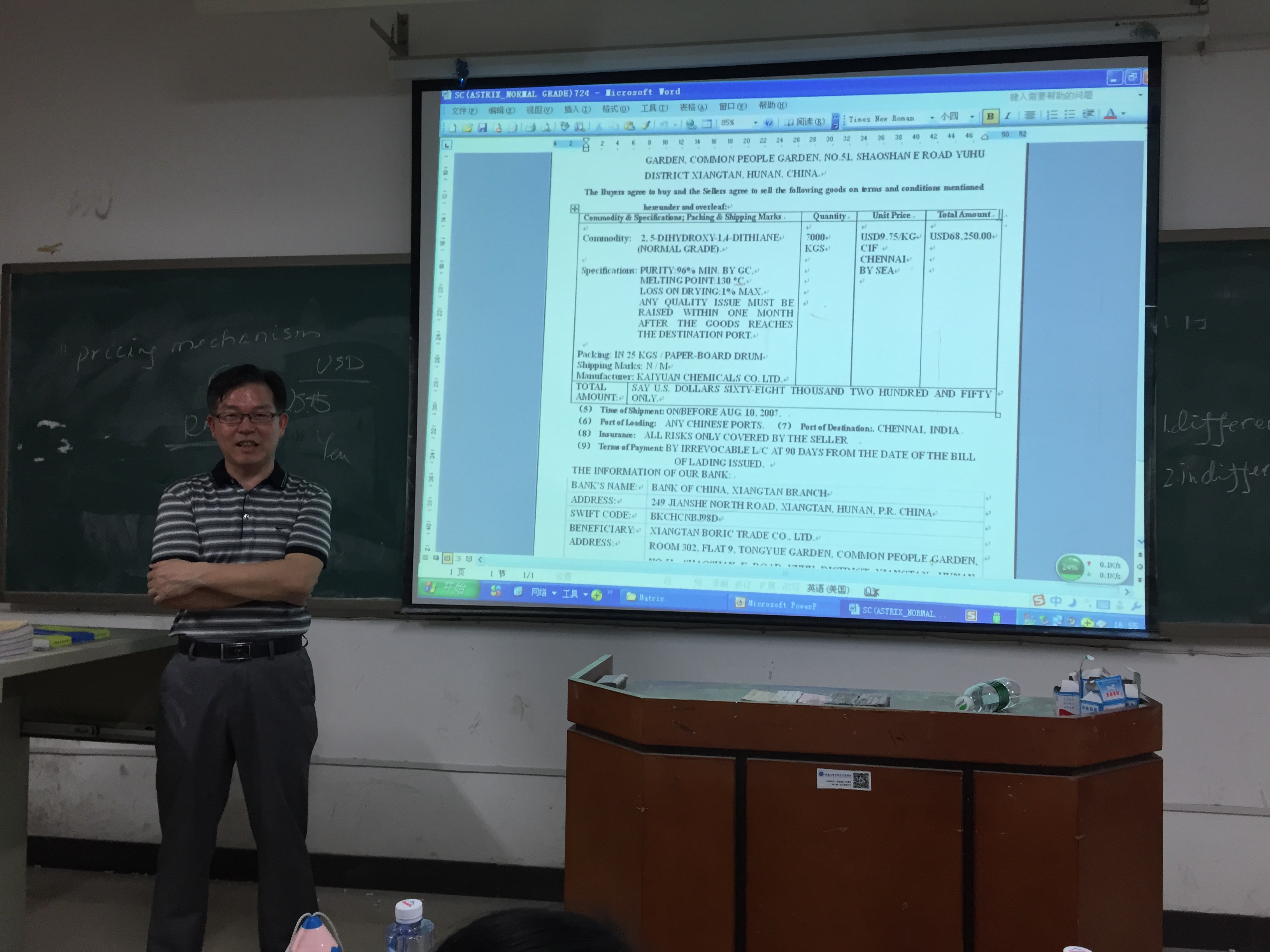 沈博士讲授的是《国际贸易实务》课程的第八章《出口报价及成交价格的计算》。他从定价机制(4Ps)切入,结合生活实际,并引用国际贸易活动中的实例,深入浅出的解释了换汇成本、出口盈亏率的计算公式和出口报价的格式和内容,并提醒员工注意其中的注意事项。