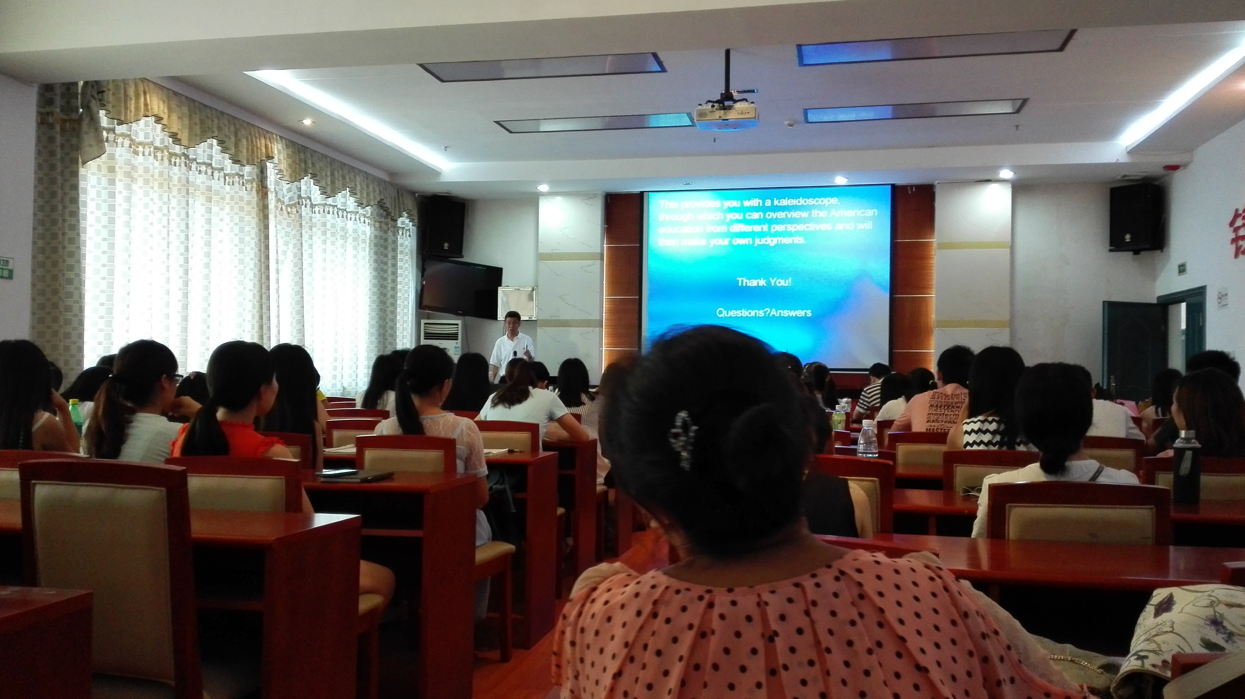 冯教授从四个方面谈了美国的教育体系。首先,他介绍了美国的传统教育价值和教育理念,那就是让所有人都享有平等的教育机会;然后,他以常青藤盟校特别是普林斯顿大学为例,介绍了美国大学的员工学习生活状况以及大学对员工的资助和激励措施,以使员工能最大限度地发挥自己的才能,最大限度地了解社会并服务社会;接着,他简要介绍了美国的多元文化对教育的影响,在多元文化背景下,美国遵循“熔炉melting plot”、“色拉salad bowl”、“马赛克mosaic”三理念,既互相融合又保留各自的文化特色;最后,冯教授也指出了美国教育存在的一些问题和面对的挑战,比如教育责任的上升和教育预算的冲突、校园安全、种族问题等。总之,冯教授为我们呈现了一幅美国教育的万花筒。