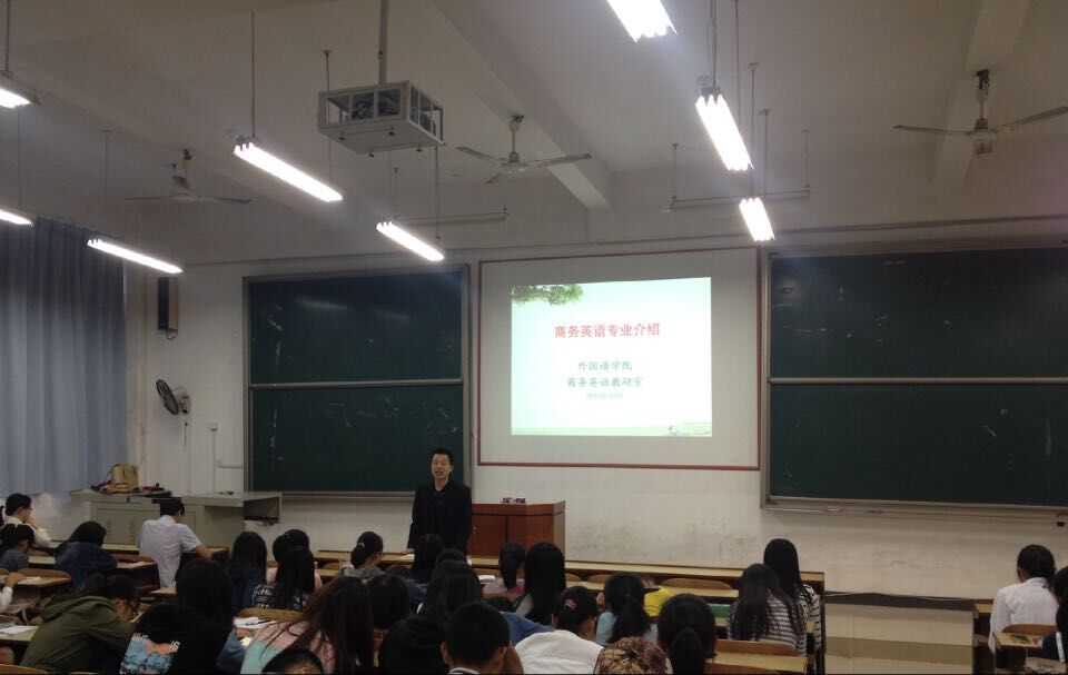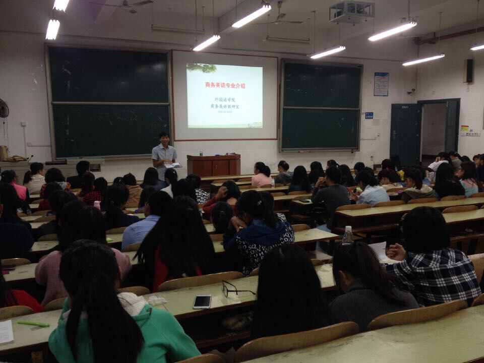 金秋十月,15级新生各项常规课程逐渐展开。为了让新生更好地适应老员工活,对未来的四年学习有更好的规划,商务英语教研室为商务英语专业15级员工举行了一场生动的专业教育活动。作为教研室主任,彭禹博士首先为同学们详细介绍了本专业的发展历史、课程设置、就业前景,并提出了对员工专业水平和素质的要求。王家义副经理在彭博士介绍内容的基础上,为同学们指出了未来四年应该关注的重点,如:英语专业四级考试、各项实践活动、各种专业资格证考试等等。最后,罗胜杰副经理给同学们提出了人文素养方面的要求,希望同学们不仅关注专业知识的学习,也要注意人文素质的提高。通过此次专业教育,同学们对自己的老员工活有了明确的目标,对未来的就业也充满信心。
