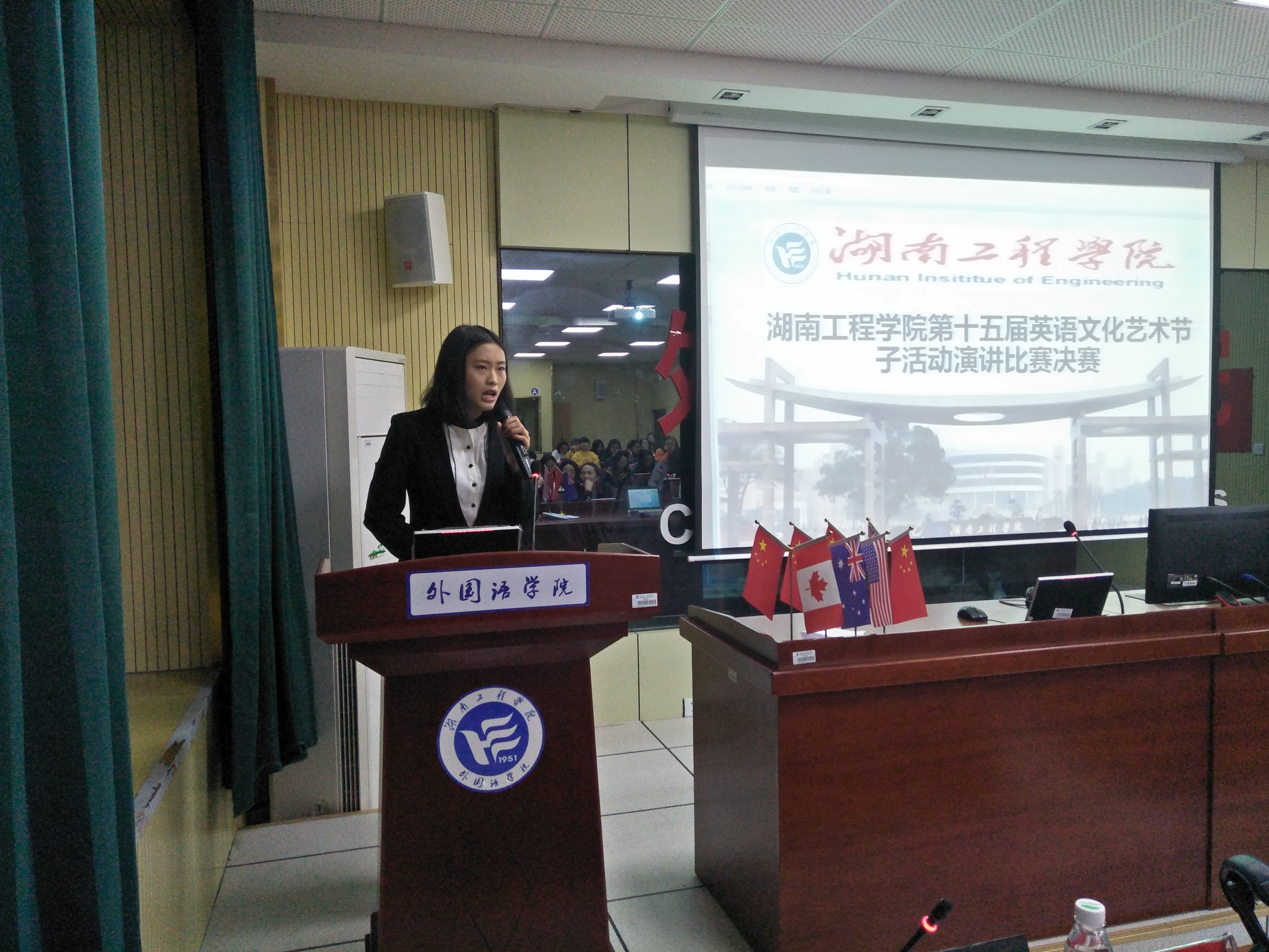 11月27日晚7点,由beats365官方网站承办的公司第十五届“梓萌杯”英语文化艺术节系列活动之英语演讲比赛决赛在新校区主教学楼F-309隆重举行,比赛由曹津维、陈宇枝主持,beats365官方网站陈锋、陈晓、朱洁老师和外教Paul等担任评委。