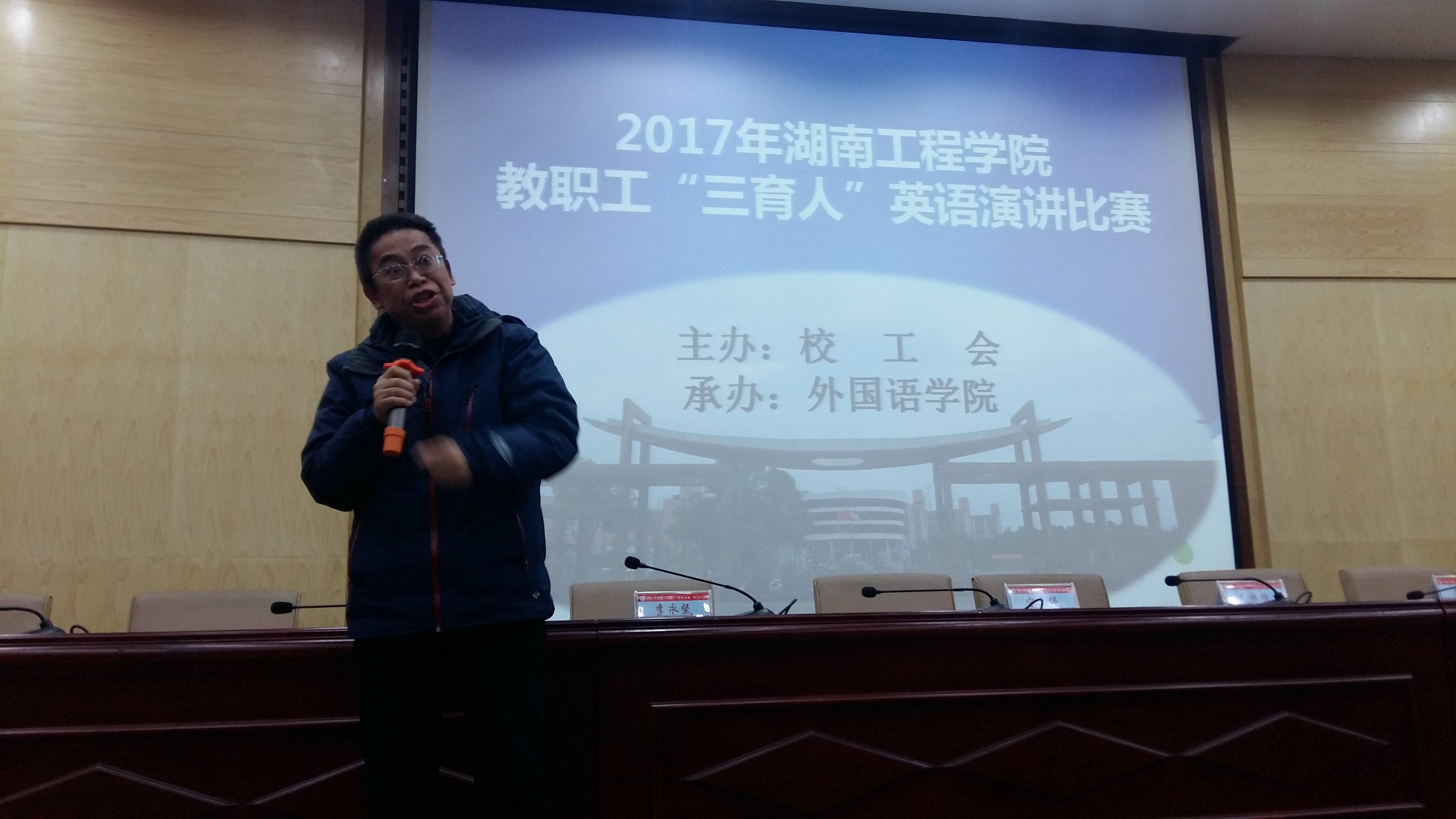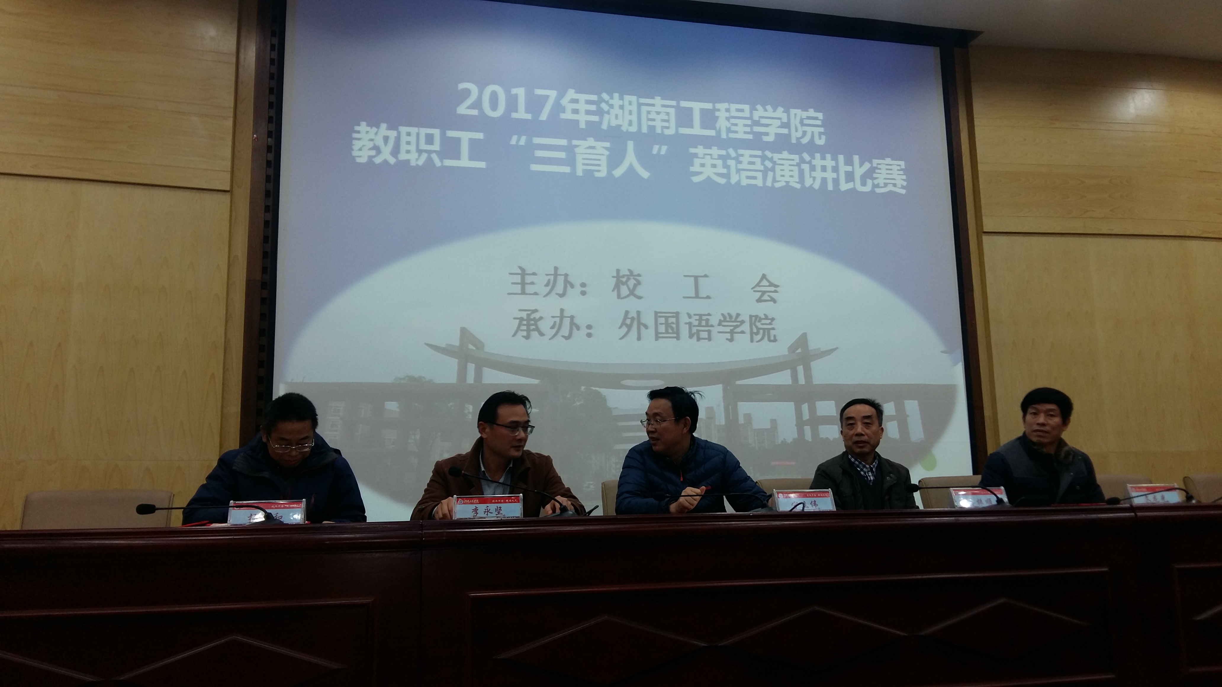 为加强公司教职工的师德师风建设,提高教职工业务素质与英语水平,公司于12月5日晚在二报告厅举办了2017年beats365官方网站教职工“三育人”英语演讲比赛。本次比赛由校工会联合人事处、教务处共同举办,beats365官方网站承办,杨永和、罗胜杰、刘向红、曹丽英、朱洁、外教Tony和Mark担任评委,李增强和陈锋担任主持,近200余名师生现场观摩。