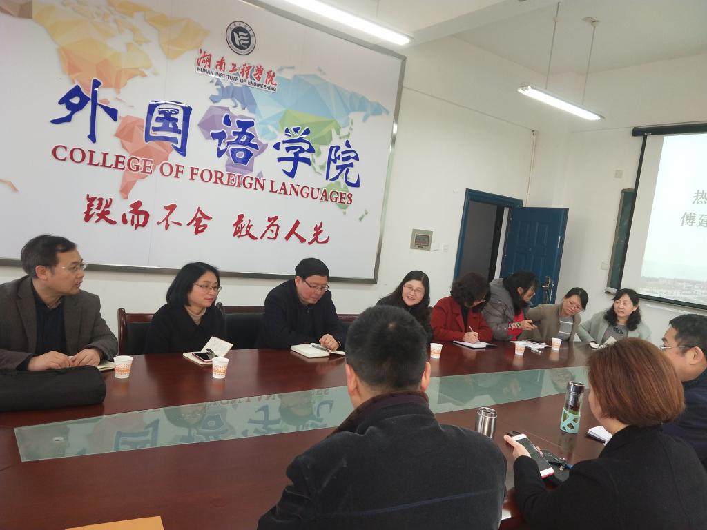 2019年3月11日,湖南城市公司人文公司经理傅建安教授一行来到beats365官方网站,进行商务英语专业建设专题交流。beats365官方网站杨永和与班子成员,以及教研室负责人在F-119热情接待客人来访。