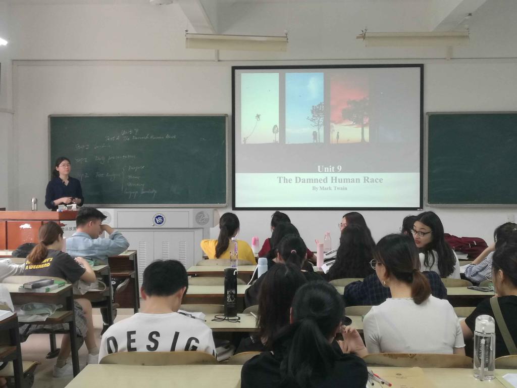 王立阳老师讲解的内容是现代大学英语(4)第15单元精读文章Text A: The Damned Human Race。她先进行了brainstorming,并联系背景知识让员工就自己的理解来猜测文章标题的含义及作者马克·吐温的写作意图。接下来是员工联系课文做presentation。之后进入了精读课文的学习。王老师先带领员工对课文做了整体的理解,讨论了课文的主题及结构,然后进入了课文的细读,从篇章段落入手,过渡到句子的理解及重点词汇的突破,多方面着手引导员工对课文进行深度分析理解。整个过程中,员工积极参与,课堂气氛热烈,教学效果很好。