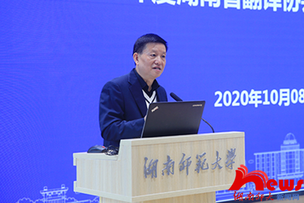 蒋洪新代表公司对各位成员的到来表示欢迎和感谢。他回忆了翻译协会创建的艰辛历程,并指出,大学就是一群具有共同理想的人聚集在一起而形成的共同体,共同体的意义不仅仅是促进大学的发展,也促进我们自身的发展。湖南省翻译协会的建立对学术的发展、对湖南外语教育事业的发展都是有着举足轻重的意义。他从湖南师范大学一流团队建设和发展的具体情况为切入点,对协会未来的建设提出希望:一是组织建设要更加健全,人员分工要更加具体;二是协会要以学术建设为主,努力走出湖南省的特色,进一步和国际打通联络;三是构建和谐、团结、奋进的团队氛围,积极鼓励和扶持青年一代“外语人“。他寄语与会人员可以同心同德、互相帮助,共同推进湖南省教育事业的发展,争取为国家、为社会、为人民做出更多有益的贡献。