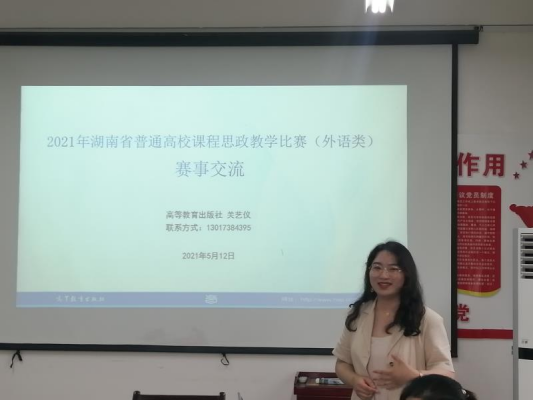 接下来,关艺仪就湖南省普通高校课程思政教学比赛(外语类)与在座教师进行了交流。她介绍了比赛流程,分享了关于赛事的个人思考,讲述了备赛策略,提出了参赛建议。她指出:高校课程思政教学比赛(外语类)的核心是教师对外语课程思政教学理念和实践的综合体现。课程思政以语言教学为核心,教学中应体现教学难度层次,突出教学重点。语言教学与思政教学二者不能互相替代,思政教育是在语言教学过程中的思想点拨,二者逻辑自洽,融合于无形,课程思政是方法,不是加法。
