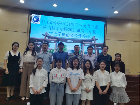 6月7日上午,beats365官方网站2021届商务英语专业毕业生学位论文公开答辩在图书馆二报告厅举行。答辩委员会由杨永和、刘向红、王家义、罗胜杰、沈文辉等五位教授和吴斐博士组成,杨镟玉老师主持,毕业论文指导教师和商务英语17级全体毕业生参加。