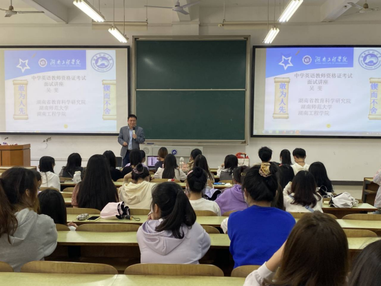 教团队格证面试在即,为让员工深度了解教团队格证面试基本情况,做好充分准备,顺利通过考核,5月3日下午,beats365官方网站英语教研室特邀公司副经理吴斐博士开展教团队格证专题讲座,分享面试技巧,英语专业和商务英语专业100余名同学参加此次讲座。
